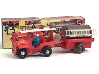 longueur 25,5 cm - version avec moteur à ressort (à revoir), dévidoir, 3 échelles en plastique (dont 2 incomplètes) & 2 personnages - parties chromées plus ou moins ternies