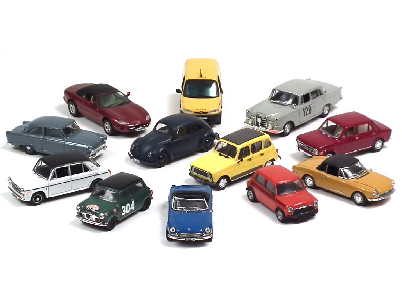 miniatures reproduisant les modèles : AUSTIN, DKW, FERRARI, FIAT (3 exemplaires dont une avec pare-brise cassé), JAGUAR, MERCEDES, MINI (2 exemplaires différents), MITSUBISHI, PEUGEOT (2 exemplaires différents), RENAULT & VOLKSWAGEN - quelques petits manques