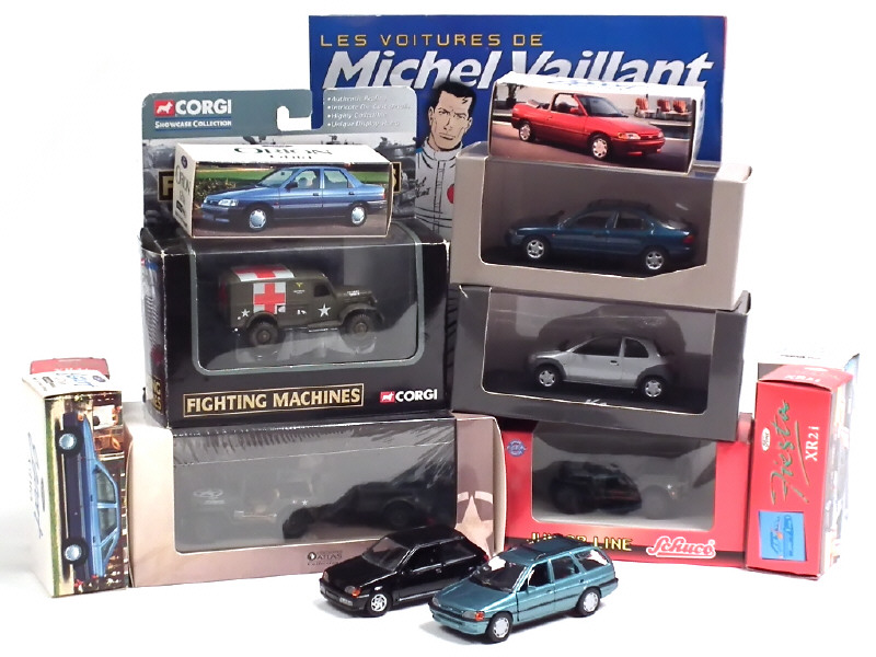 comprend : FORD ESCORT (3 exemplaires différents dont un avec lunette arrière désolidarisé de son logement & une autre avec hayon cassé), KA, FIESTA (2 exemplaires différents), ORION, MONDEO, DODGE ambulance & JEEP (2 exemplaires avec remorque) - on y joint un fascicule 'MICHEL VAILLANT' des éditions ALTAYA - on y retrouve les marques : CORGI TOYS (boîte en état 'c'), SCHABAK, SCHUCO, MINICHAMPS & EDITIONS ATLAS