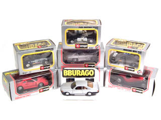 échelle 1/24ème - comprend : MERCEDES 190 E, SOO SL, 500 SEC, PORSCHE CARRERA RS, FORD MUSTANG 'POLICE', FERRARI F40, BUGATTI type 55 & ATLANTIC - quelques petits éléments manquants