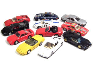 échelle 1/24ème - états de 'A' à 'D' - miniatures reproduisant les modèles : FERRARI (5 exemplaires différents) LAMBORGHINI, PORSCHE (3 exemplaires différents), MERCEDES & CHEVROLET - avec manques & quelques parties cassées - on y retrouve les marques : BBURAGO, GUILOY & MAJORETTE