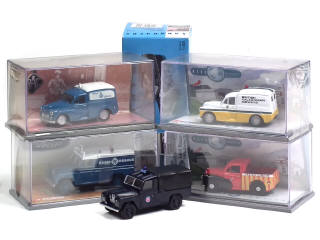 comprend : LAND ROVER LWB 'RAC', MORRIS 1000 fourgonnette 'RAC', 'BCA' & pick up 'DAN AIR LONDON' (boîte en état 'c') - 3 modèles sous films plastique jamais ouverts - on y joint une LAND ROVER LWB 'KENT COUNTY CONSTABULARY' (état 'A-.b', série VANGUARDS de la marque LLEDO)