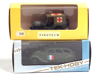comprend : JEEP WILLYS Ambulance de l'armée américaine (FIRETECH sur base SOLIDO) & PEUGEOT 402 B 1939 de l'armée française