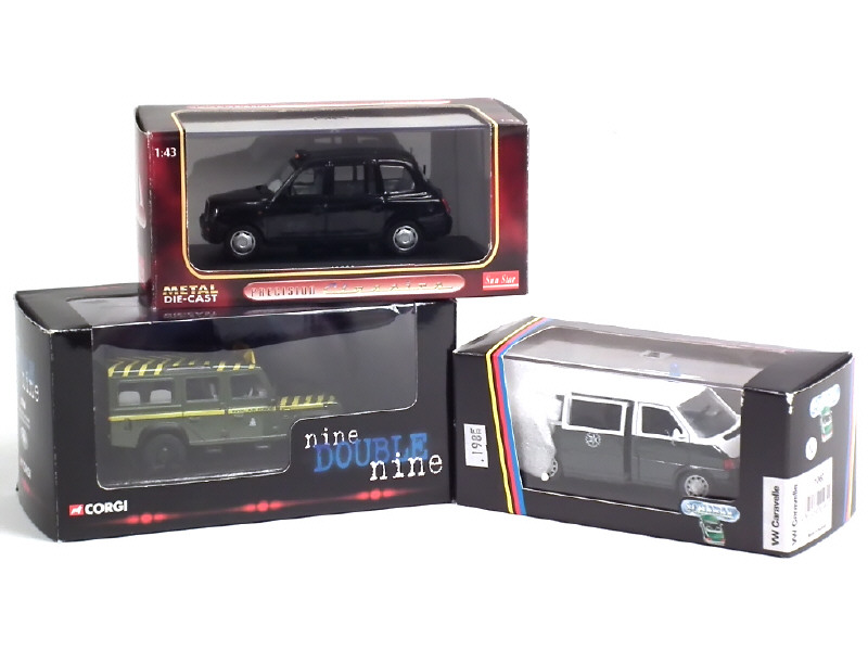comprend : VOLKSWAGEN CARAVELLE d'intervention, AUSTIN TX1 LONDON TAXI & LAND ROVER DEFENDER 'RAF' - on y retrouve les marques : SCHABAK, SUN STAR & CORGI TOYS