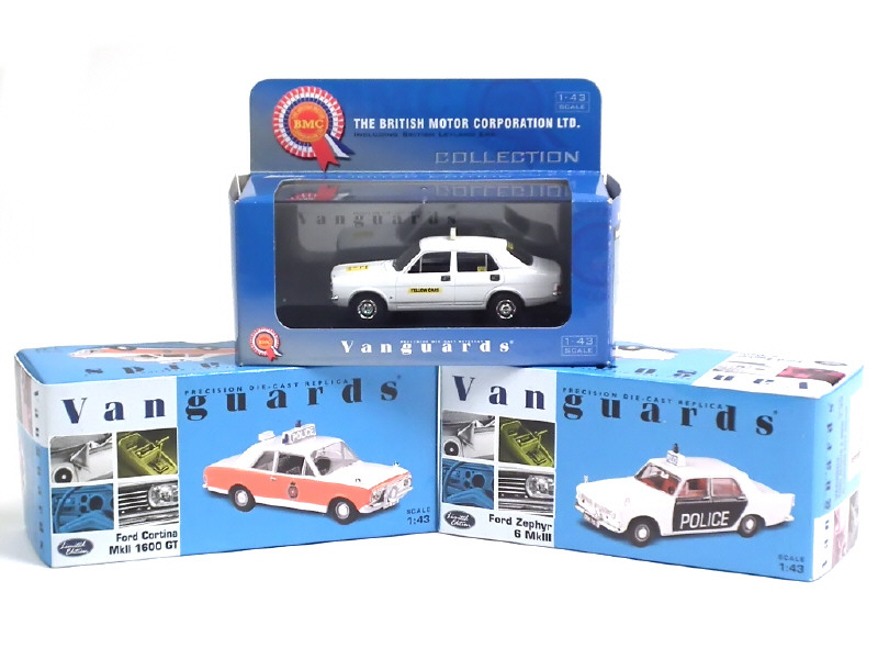 comprend : FORD CORTINA 1600 GT MKII 'POLICE', ZEPHYR 6 MKIII 'POLICE' & MORRIS MARINA 1800 'TAXI' - un blister intérieur de boîte incomplet