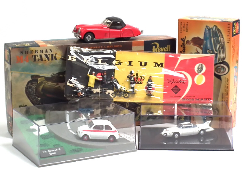 différentes échelles -comprend : FIAT NUOVA 500, GM FIREBIRD II, JAGUAR XK 120 (en état A- & sans boîte) & BUICK RIVIERA (kit en plastique à monter, semble complet) - on y retrouve les marques : NOREV, CORGI TOYS & REVELL - on y joint un blister (incomplet) de 6 figurines de la marque REISLER & une boîte vide de char SHERMAN M4 d ela marque REVELL