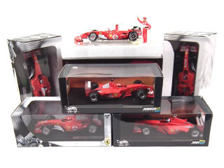 échelle 1/18ème - collection 'HOTWHEELS' - comprend : F1 2000 (2 exemplaires différents - pilotes : BARRICELLO & SCHUMACHER), F 2004 (pilote : BARRICELLO), F 2005 (2 exemplaires différents - pilotes : BARRICELLO & SCHUMACHER) & 248 2006 (pilote : SCHUMACHER - sur socle de présentation - série limitée numérotée 2458/9250 exemplaires - avec figurine du pilote, un casque & un fascicule commémoratif