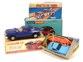 comprend : CHEVROLET CORVETTE téléguidée, CAMARO, PORSCHE LE MANS (boîte non conforme) & DUNE BUGGY (sur base VOLKSWAGEN) - moteurs à piles (non testés) - on y retrouve les marques : ASAHI & SOLPA
