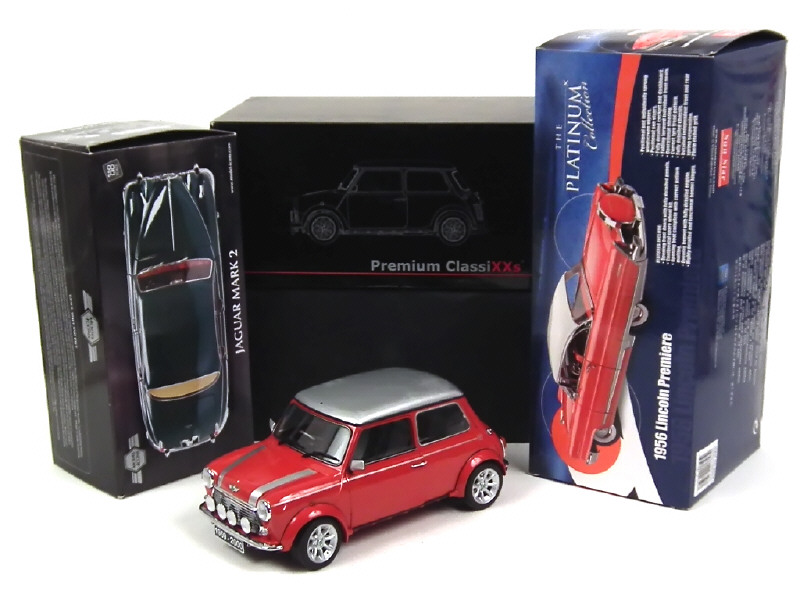 comprend : BMW Z8 (un toit manquant), MINI COOPER sport (avec sachets d'accessoires & petit dépliant), JAGUAR MARK 2 (avec certificat d'édition limité numéroté 533/3500 exemplaires) & LINCOLN PREMIERE 1956 (avec petit dépliant) - on y retrouve les marques : KYOSHO, SUN STAR, MODEL-ICONS & PREMIUM CLASSIXXS