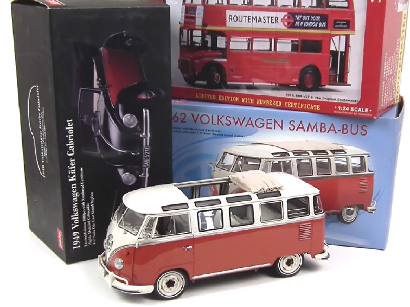 comprend : VOLKSWAGEN cabriolet 1949 (série limitée à 3000 exemplaires, accessoires & notices sous sachets - quelques petites pièces à refixer), minibus 1962 (échelle 1/12ème avec certificat d'édition limitée numéroté 1183/5000 exemplaires & accessoires) & bus londonien à 2 étages (échelle 1/24ème, série limitée, manque certificat, un petit élément à refixer)