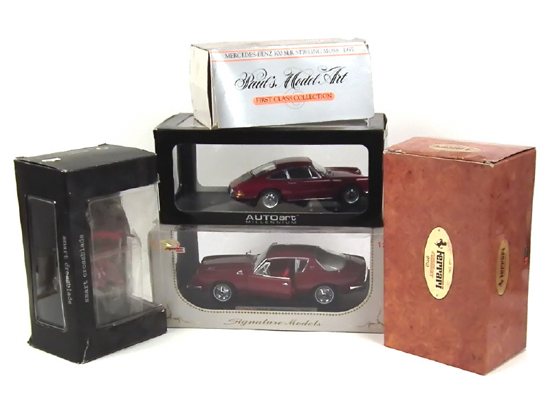 comprend : MERCEDES 300 SLR 1955 (avec certificats d'édition limitée, suremballage à recoller), FERRARI 456GT (sur socle de présentation, carrosserie légèrement encrassée), SMART (échelle 1/18ème), PORSCHE 911 1964 & STUDEBAKER 1963 - on y retrouve notamment les marques : MINICHAMPS, BBURAGO, SIGNATURE MODELS (échelle 1/18ème) & AUTOART (échelle 1/18ème) - boîtes encrassées