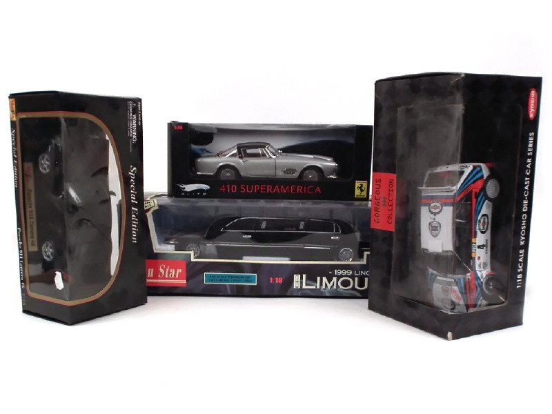 échelle 1/18ème - comprend : LANCIA DELTA (quelques optiques de phares à recoller, boîte en état 'c'), PORSCHE 911 CARRERA 4S, FERRARI 410 SUPERAMERICA (série à 10000 exemplaires) & LINCOLN LIMOUSINE 1999 - on y retrouve les marques : SUN STAR, MAISTO, KYOSHO & MATTEL - boîtes encrassées
