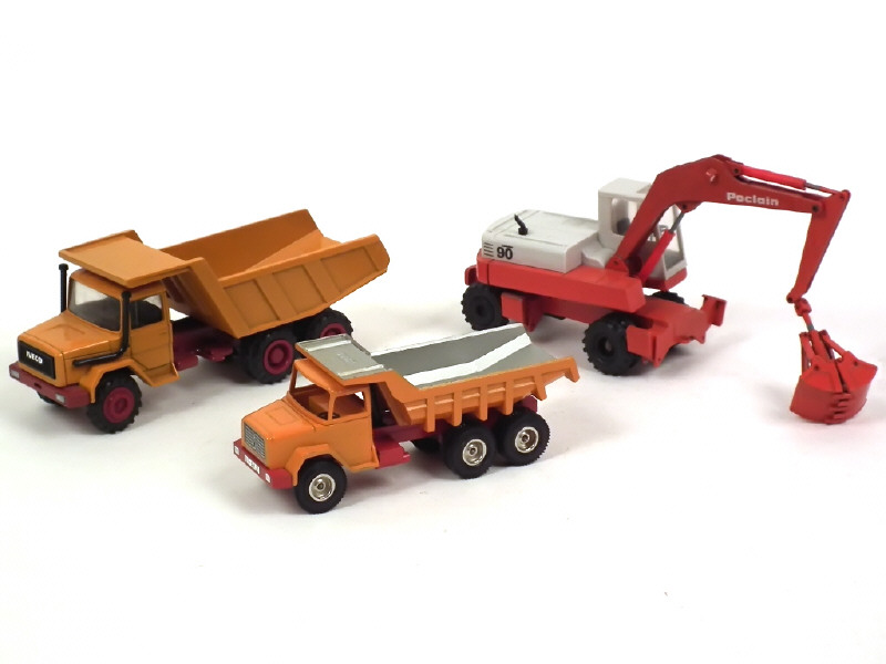états de 'B' à 'C' - comprend : POCLAIN 90 grue sur pneus avec benne preneuse, IVECO & MAGIRUS-DEUTZ bennes carrières - on y retrouve les marques : NZG & CURSOR MODEL- avec petits manques