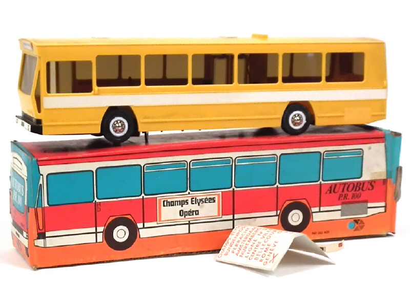 longueur 37 cm - moteur à piles (non testé) - la mise en marche de l'autobus s'effectue par l'insertion d'un ticket de R.A.T.P. dans une fente située sur le toit - avec ticket de bus & planche d'autocollants - boîte tachée