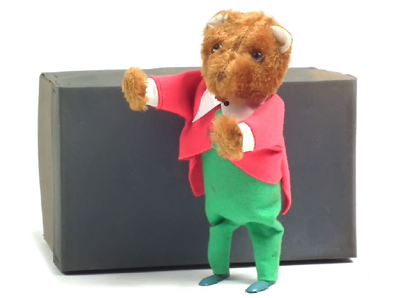 hauteur : 18 cm - moteur à ressort (fonctionne) - en action, l'animal se dandine & se déplace grâce aux vibrations - boîte en partie décolorée avec agrafes oxydées
