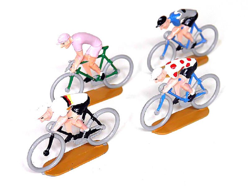 comprend 4 cyclistes dont un maillot du meiileur grimpeur & un maillot rose - version tout métal - sur socle