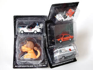 miniatures reproduisant les modèles : CITROEN MEHARI, RENAULT 18, PEUGEOT 203, PEUGEOT J7 & kart