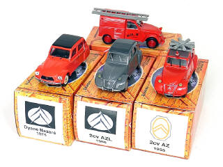 miniatures reproduisant les modèles : 2CV AZL 1956, DYANE NAZARE 1975, 2CV AZU 1955 & 2CV AZ 1955