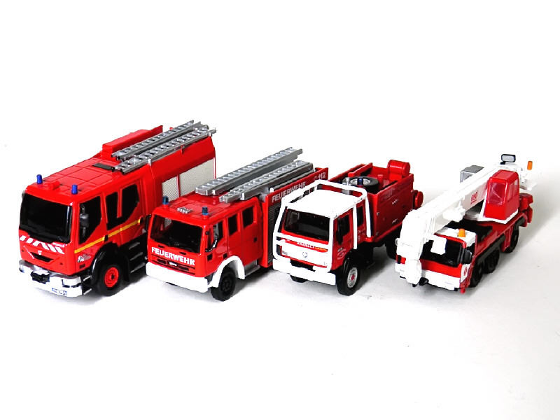miniatures reproduisant les modèles : RENAULT M210-12 CAMIVA, RENAULT FPTHR, IVECO MAGIRUS & un camion grue (peits manques)