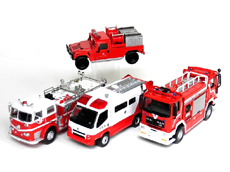 miniatures reproduisant les modèles : MORITA 2002 (une petite trace de colle sur le pare-brise), HUMMER 1992, MAN JANUS 2001 & SEAGRAVE type K