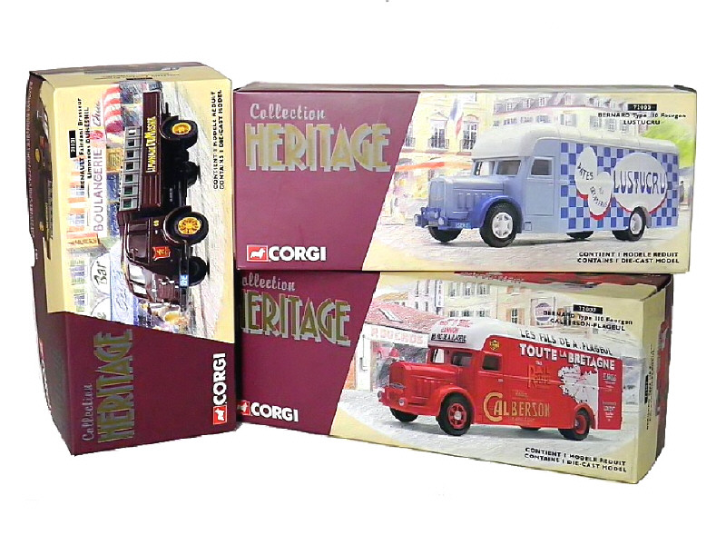 collection HERITAGE - miniatures reproduisant les modèles : RENAULT FAINEANT brasseur (manques les rétroviseurs) & BERNARD 110 fourgons (CALBERSON & LUSTUCRU)