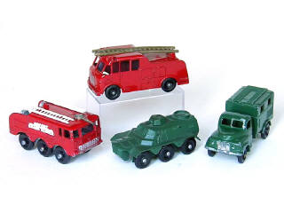 états de 'A' à 'C' - miniatures reproduisant les modèles : AEC MERRYWEATHER pompier, FOAMITE pompier d'aéroport (manque une décoration latérale), SARACEN transport de troupes militaire & AUSTIN MK2 radio militaire