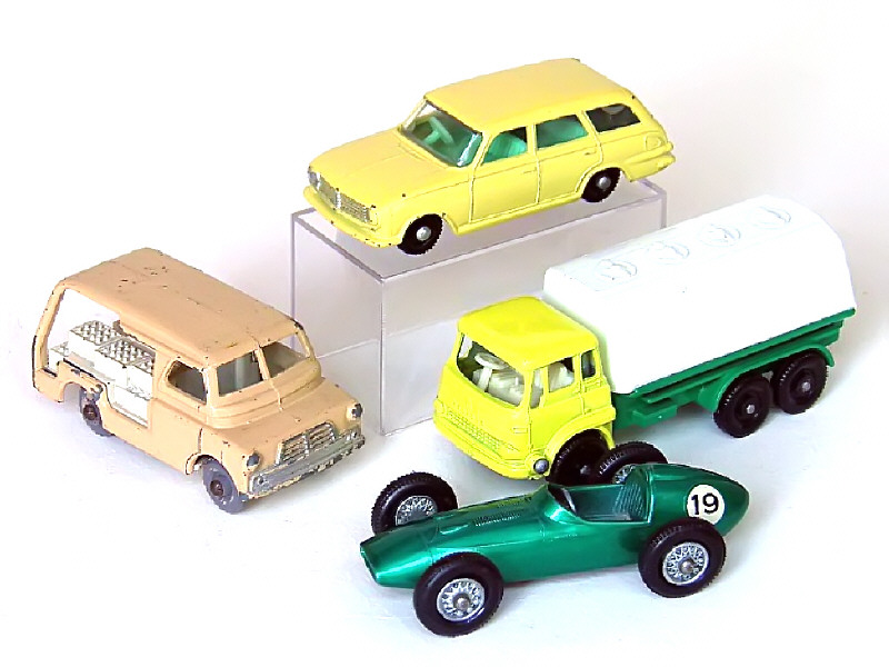 états de 'A' à 'B' - miniatures reproduisant les modèles : VAUXHALL VICTOR, BEFORD citerne 'BP' (manque un décalque), ASTON MARTIN DB5 (manque le pilote) & BEDFORD laitier (état 'd')