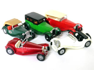 miniatures reproduisant les modèles : LANCIA DILAMBDA,MG TC, RILEY, JAGUAR SS100 - on y retrouve les marques : RIO & MATCHBOX YESTERYEAR