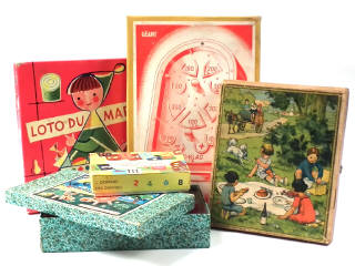 comprend : jeu de cubes en bois (état 'C'), 'DOMINO DES CHIFFRES' (quelques cartes légèrement endommagées), 'LE COCHON QUIT RIT' & 'LOTO DU MARCHE' - rhodoïde du flipper endommagé - possibilité d'éléments manquants