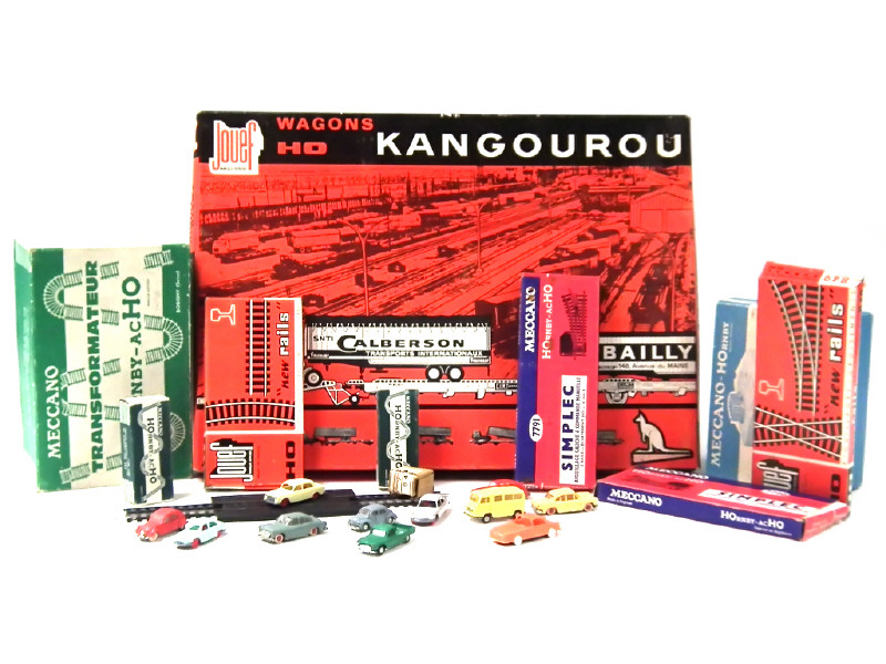 états de 'A' à 'E' - comprend : coffret 'KANGOUROU', 2 transformateurs, différents rails dont certains avec boîtes, figurines & pièces de maquettes - on y joint 14 véhicules - on y retrouve les marques : JOUEF, HORNBY & NOREV - avec manques & parties cassées