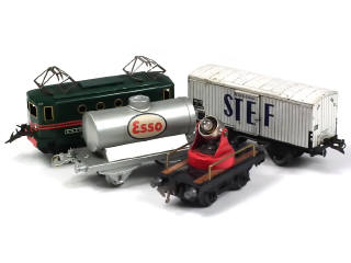 comprend : BB 8051 (version mécanique fonctionne & état 'C' avec traces d'oxydation), wagon frigorifique 'STEF' (état 'D') & citerne 'ESSO' (état 'B') - on y joint un wagon-plateau avec projecteur de la marque JEP en état 'C' (quelques parties de plateau repeintes)