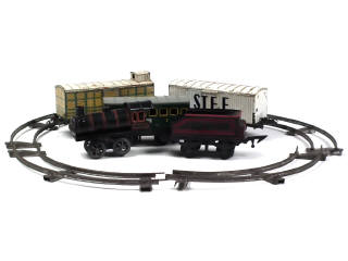 états de 'D' à 'E' - comprend : voiture de voyageurs de 2ème classe (état 'C'), wagon frigorifique 'STEF' & wagon à lait - on y joint 4 rails courbes - on y retrouve notamment la marque HORNBY - un élément recollé - traces d'oxydation