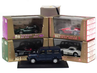 comprend : JAGUAR HP 160 3.5 L (2 exemplaires différents), VANWALL HP 285 (suremballage en état 'b') & FERRARI 500 F2 - on y joint une MERCEDES CLASSE G de la marque PARADCAR (annotations sur la boîte)