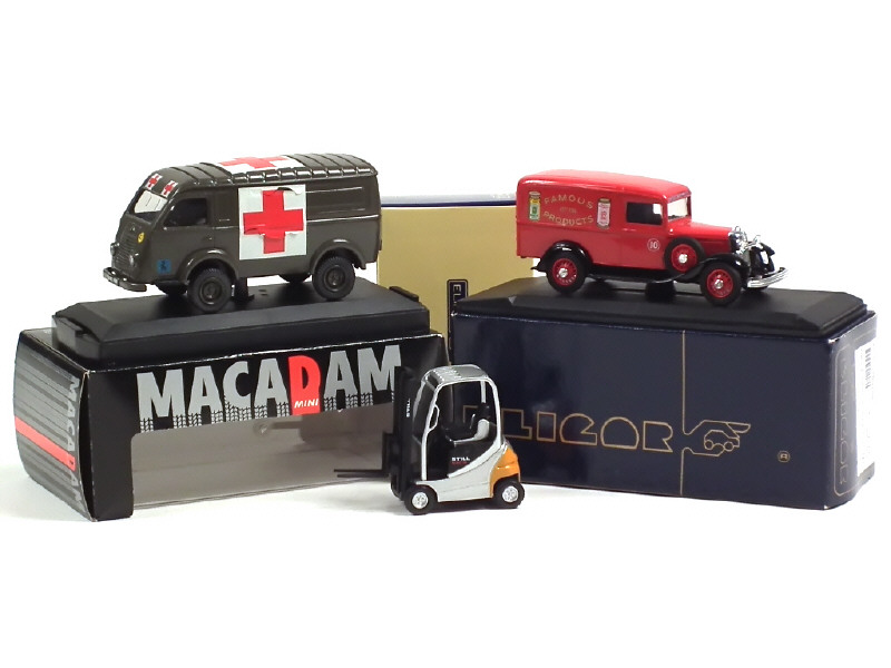 comprend : FORD V8 camionnette 'CROSS & BLACKWELL', chariot élévateur STILL & RENAULT 1000kg ambulance militaire (un décalque latéral incomplet) - on y retrouve les marques : ELIGOR & MACADAM
