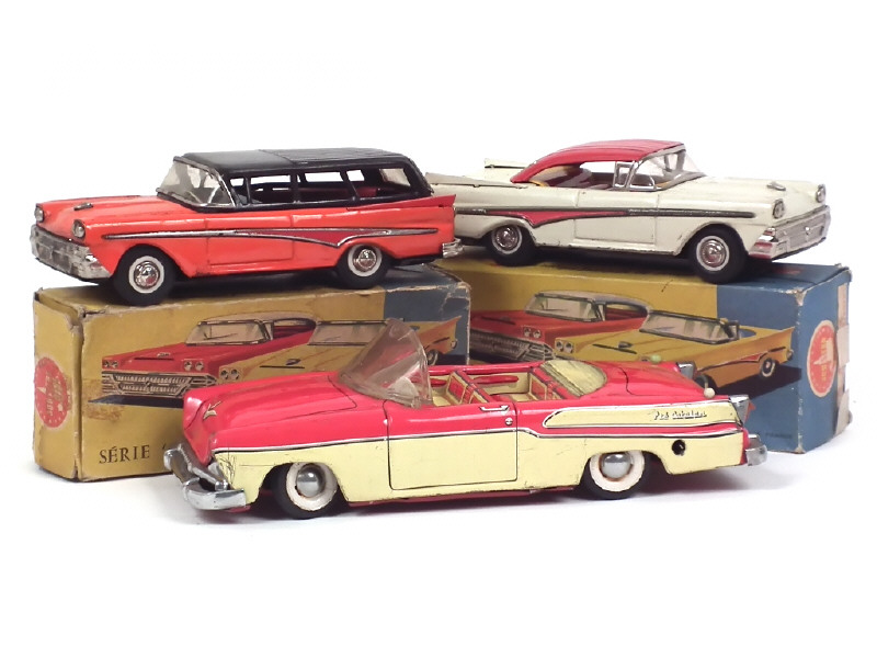 série 'CADET' - longueur 19 cm - moteur à friction (fonctionne) - traces d'oxydation - éclats majeurs sur le pare-brise - on y joint un cabriolet 'PRE CATELAN' de la marque GEM (état 'C', avec plancher déformé)