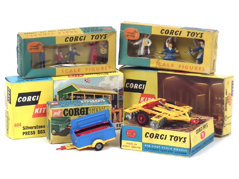 on y joint une remorque à outils (avec balai & pelle, référence 109), 4 boîtes d'accessoires & figurines des références 604, 606 (un petit élément cassé), 1502 & 1505 - semblent complets - quelques boîtes en état 'c'