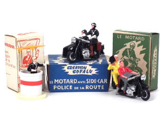 comprend : un motard avec side-car 'POLICE DE LA ROUTE' (petites traces de ruban adhésif), un motard presse avec cinéaste du 'TOUR DE FRANCE' & un mirador avec agent de la circulation
