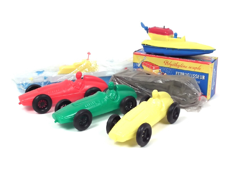réalisations en plastique - on y retrouve notamment les marques : FALK & SOP - hydroglisseur avec boîte (état 'c', avec une petite perforation), câle, clef & moteur à clef (fonctionne)