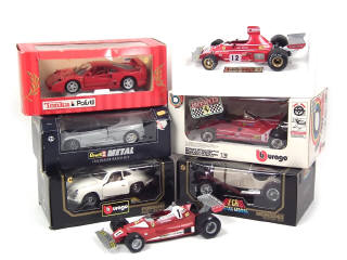 échelle 1/18ème - comprend : MERCEDES BENZ SSK 1928, PORSCHE 356 B coupé 1962, ITALDESIGN NAZCA M12 (état 'B.c'), FERRARI T5 F1 (échelle 1/14ème), 312 T2 F1 (échelle 1/16ème), F40 (boîte en état 'c') & F1 (boîte en état 'c', échelle 1/16ème) - on y retrouve les marques : POLISTIL, TONKA-POLISTIL, BBURAGO & REVELL