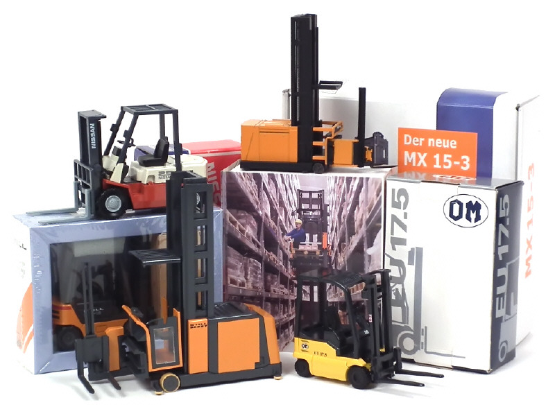 comprend : NISSAN 25 (boîte en état 'a'), STILL SAXBY MX 15-3 (une portière à refixer, boîte déformée), STILL R70-16 (état 'A+.a' sous blister jamais ouvert), OM EU 17.5 & STILL SAXBY MX 13 (état 'A-') - on y retrouve notamment les marques : NZG, CONRAD & OLD CARS