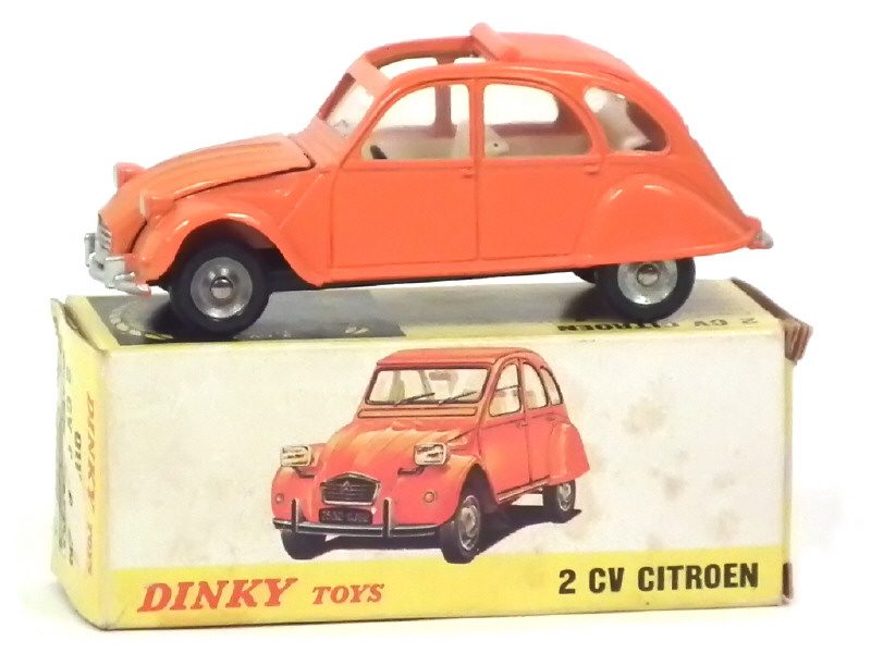 DINKY TOYS (FRANCE) 500 CITROËN 2CV Décapotée (made in SPAIN) orange avec plancher vissé & plaque minéralogique arrière argent