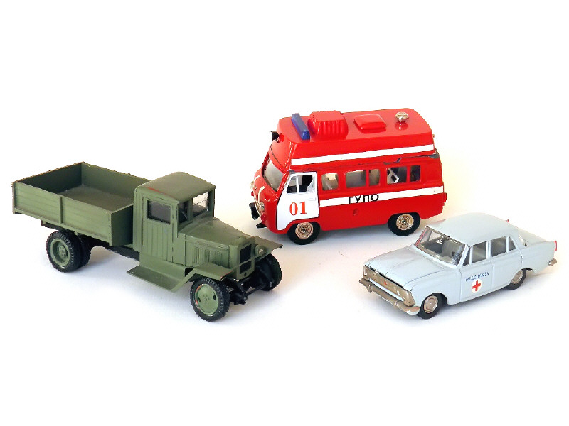 états de 'B' à 'F' - miniatures reproduisant les modèles : MOSKVITCH 408 sanitaire, ZIS plateau à ridelles (manque une roue jumelée) & UAZ 452 pompiers (châssis cassé, modèle à reconstitué) - importantes traces de métal fatigue
