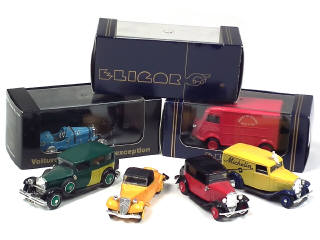 comprend : ROLLS ROYCE (boîte non conforme, manque sigle de calandre), BUGATTI TYPE 51 (manque un pneu), CITROEN 1200kg de pompiers, traction cabriolet, ROSALIE 'TAXI' & 500kg 'MICHELIN' - 3 modèles sans boîte