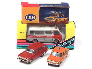 comprend : RAF ambulance (état 'C' avec importantes traces de matal fatigue sur l'ensemble du modèle & petits manques), LADA 2101 & MOSCKVITCH 427 break (sans boîte)