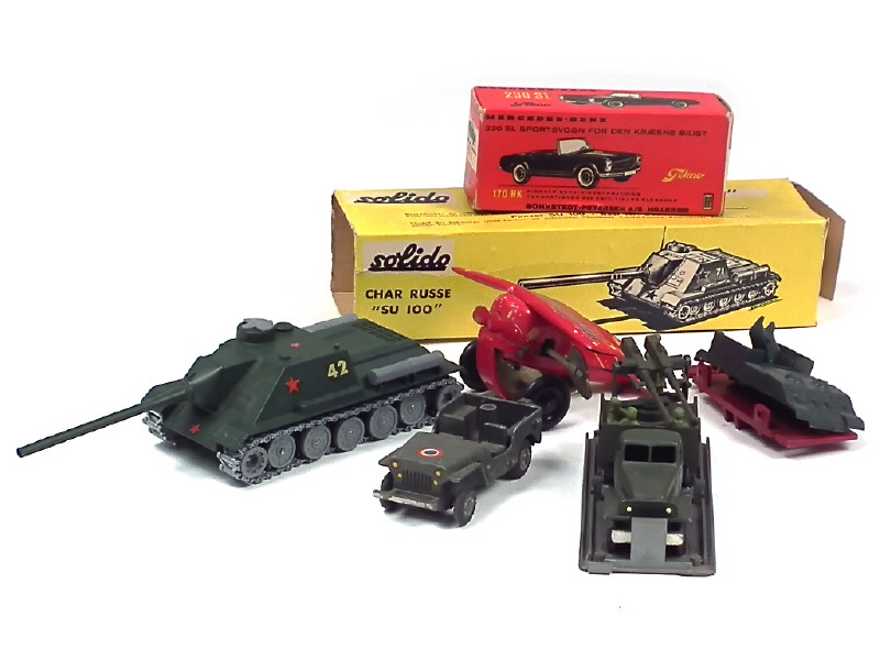 états de 'B' à 'F' - comprend : char SU 100, JEEP, GMC & un avion en tôle lithographiée - on y retrouve notamment les modèles : SOLIDO (avec boîte en état 'e'), FRANCE JOUET (un exemplaire avec boîte en état 'd' & un autre avec parties non d'origine) & MS - on y joint un boîte vide référence 929 (état 'c') de la marque TEKNO DANEMARK - quelques manques