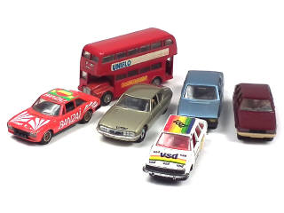états de 'B' à 'D' - comprend : CITROEN SM (2 décalques ajoutés), SIMCA 1308 GT, RENAULT 30 TS, PEUGEOT 504 coupé, 604 & AEC autobus londonien - quelques petits manques - on y retrouve les marques : BUDGIE TOY, NOREV & SOLIDO