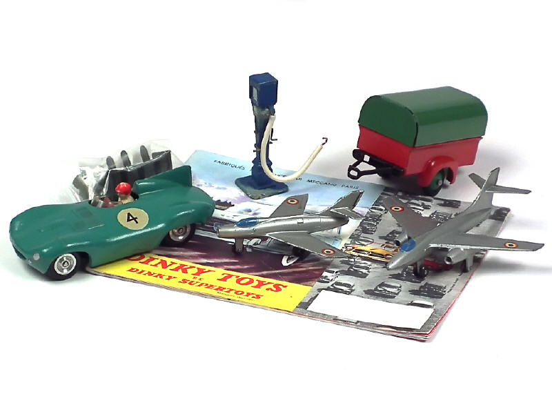 comprend : VAUTOUR & MYSTERE IV - quelques parties très légèrement déformées - on y joint une remorque bâchée à un essieu (état 'C'), une pompe à essence (état 'D' avec importantes traces d'humidité & tuyau non d'origine), 2 personnages militaires avec pas de lancement & missile SS10, un catalogue 1961 (état 'b' avec importantes annotations) & JAGUAR Le Mans (état 'C' de la marque SOLIDO)
