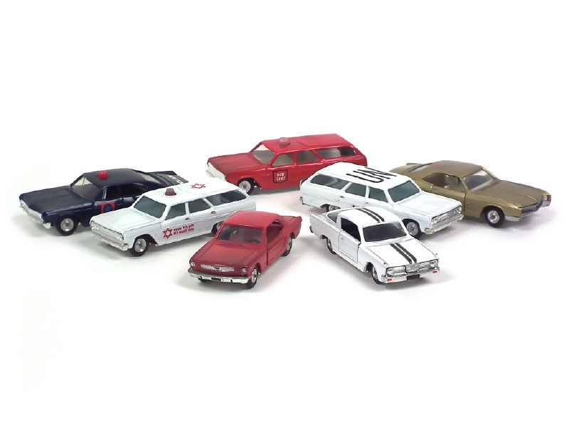 série 'SABRA' - comprend les modèles : BUICK RIVIERA, PLYMOUTH BARRACUDA, CHEVROLET (3 exemplaires différents) & FORD MUSTANG - carrosseries légèrement encrassées - petits détails de peinture ajoutés
