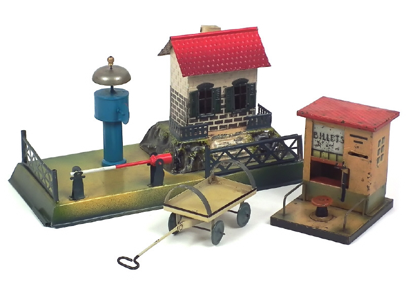 comprend : maison de garde-barrière avec passage à niveaux & signal sonore (état 'C', mécanisme à revoir, parties non d'origine restaurées & repeintes), guichet électrique (état 'D') & chariot de gare (état 'B', quelques éclats sur la barre d'attelage) - on y retrouve notamment la marque KIBRI - quelques petits manques & légères traces d'oxydation