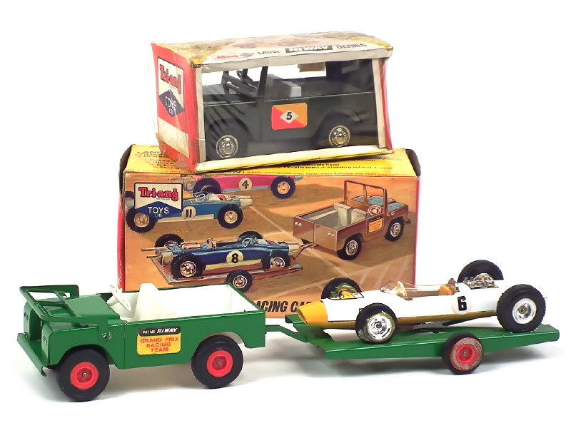 TRI-ANG (GB) LAND ROVER 'GRAND PRIX RACING TEAM' avec remorque vert, blanc & jaune